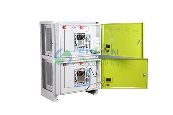 低空油煙凈化器采用機械凈化和靜電凈化雙重凈化方式。油煙等氣體被風(fēng)機吸入管道后,首先輸入初級裝置——凈化整流室,采用重力慣性凈化技術(shù),室內(nèi)的特殊分層結(jié)構(gòu)逐步對大粒徑污染物進行分級物理分離,并且均衡整流,分離出的大顆粒油滴在自身重力的作用下流入油槽排出,然后小顆粒空氣混合物會通過靜電場前的過濾網(wǎng)再次過濾,最后進入高壓靜電場,在被電離后,離子別正負兩極分別吸附,達到空氣微小顆粒的凈化,