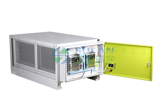 低空油煙凈化器采用機(jī)械凈化和靜電凈化雙重凈化方式。油煙等氣體被風(fēng)機(jī)吸入管道后,首先輸入初級(jí)裝置——凈化整流室,采用重力慣性凈化技術(shù),室內(nèi)的特殊分層結(jié)構(gòu)逐步對(duì)大粒徑污染物進(jìn)行分級(jí)物理分離,并且均衡整流,分離出的大顆粒油滴在自身重力的作用下流入油槽排出,然后小顆??諝饣旌衔飼?huì)通過靜電場(chǎng)前的過濾網(wǎng)再次過濾,最后進(jìn)入高壓靜電場(chǎng),在被電離后,離子別正負(fù)兩極分別吸附,達(dá)到空氣微小顆粒的凈化,